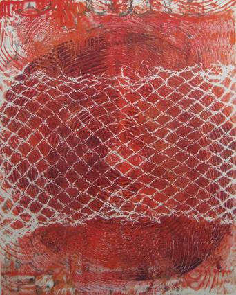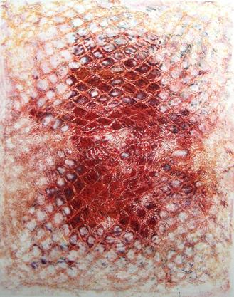 drawing on frottage and chine-colle' infused with encaustic on panel. 16x16x2in